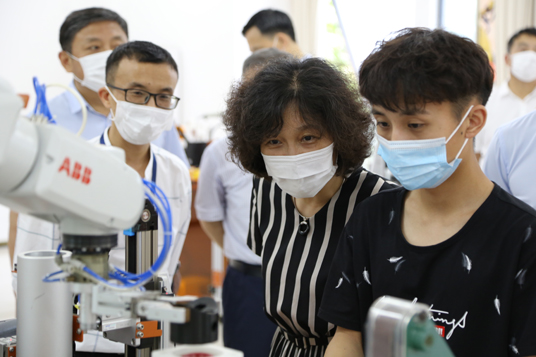 张姬雯先后实地走访了我校省级建筑工程技术综合实训基地、国家级工业机器人开放式公共实训基地、国家级护理实训中心及学院GMP教学工厂和中药文化馆。调研过程中,张姬雯详细了解了我校的基本办学情况,每到一处,张姬雯都与师生进行了深入交流。张姬雯对我校的办学成果表示充分肯定,并对我校发展改革提出了要求和建议。
