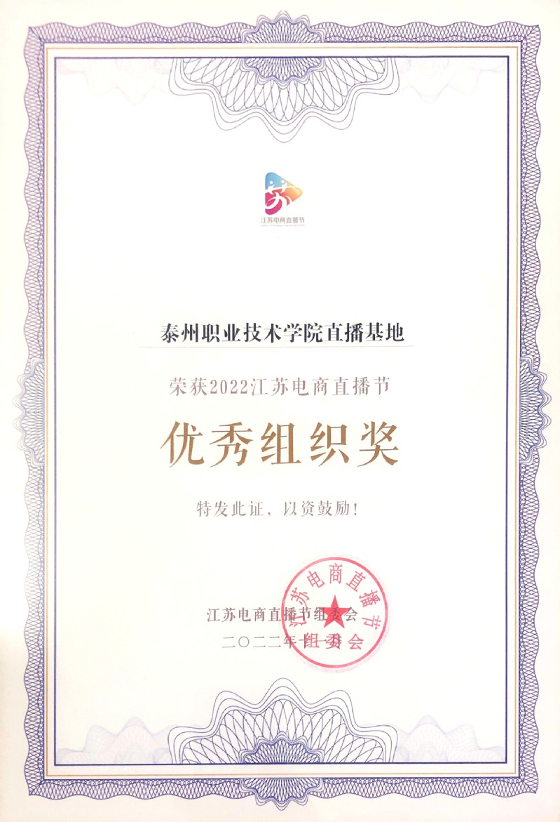 近日,江苏省商务厅公布了2022江苏电商直播节暨首届电商直播技能大赛获奖名单,我院获评为“优秀组织奖”,这也是泰州众多直播基地中唯一获奖单位。