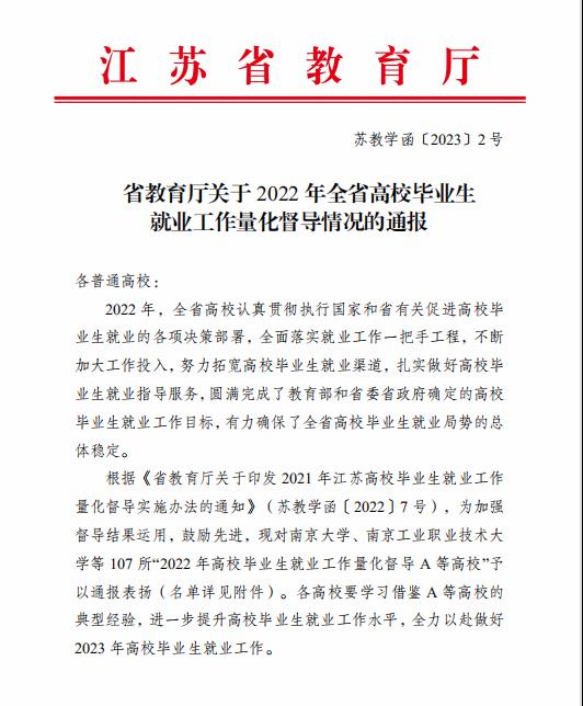 近日,江苏省教育厅印发《省教育厅关于2022年全省高校毕业生就业工作量化督导情况的通报》(苏教学函〔2022〕2号),我校荣获A等(第一等次),这是继2020年获得此荣誉后,我校第二次获A等次。