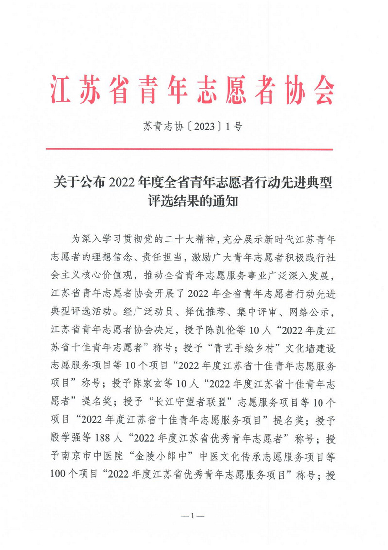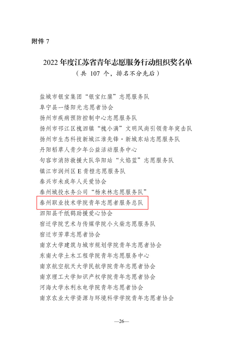 近日,江苏省青年志愿者协会公布了2022年度全省青年志愿者行动先进典型评选结果。泰州职业技术学院青年志愿者服务总队荣获“2022年度江苏省青年志愿服务行动组织奖”。