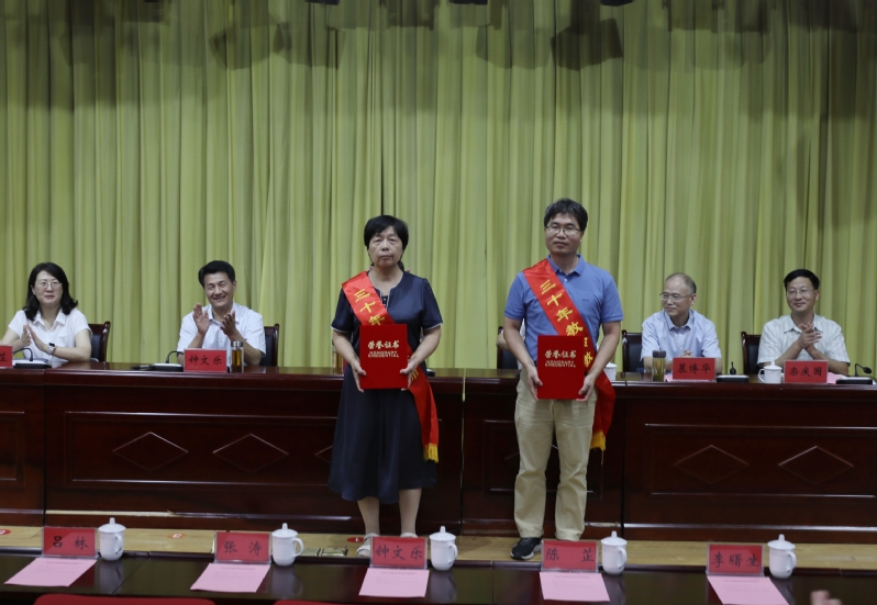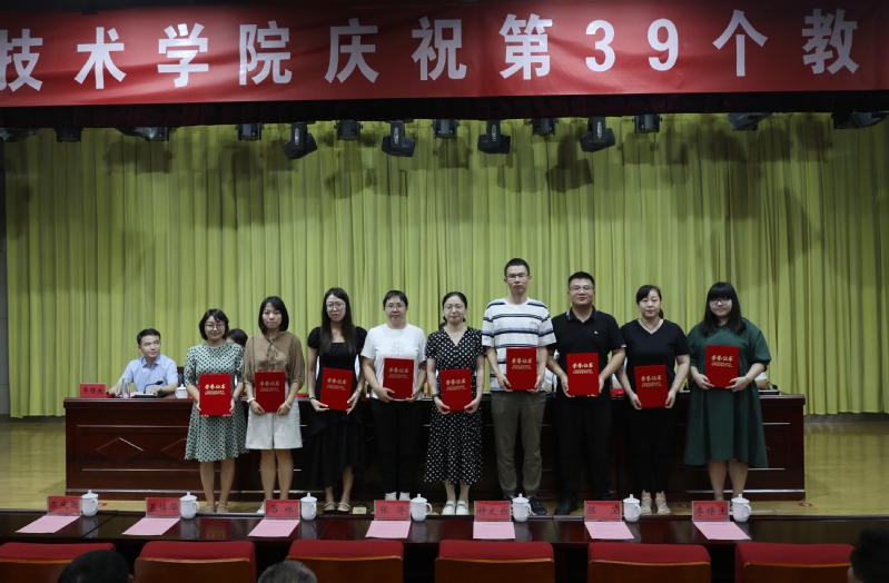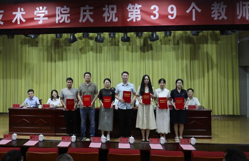 会上,通报表扬了一年来学校市级及以上荣誉获得者,对2023年企业实践优秀教师、校优秀班主任及辅导员、2023年“校训奖”获得者进行了表彰,并为从教满三十周年的教师颁发荣誉证书。