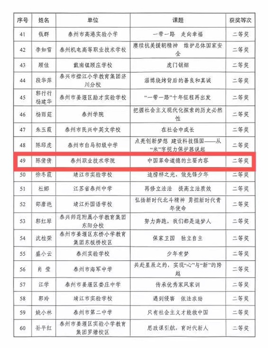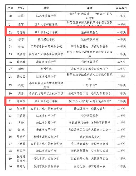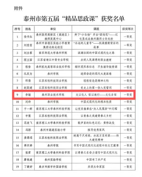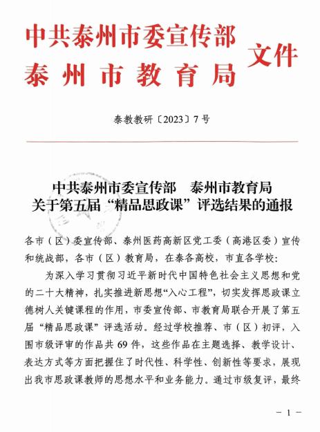为深入学习贯彻习近平新时代中国特色社会主义思想和党的二十大精神,扎实推进新思想“入心工程”,切实发挥思政课立德树人关键课程的作用,市委宣传部、市教育局联合开展了第五届“精品思政课”评选活动。经过学校推荐、市(区)初评、复评,我校马克思主义学院马传浩老师的“坚持系统观念”、李敏老师的“文以化人、信以致行——文化自信“课题荣获一等奖、施红玉老师的“从天下大同到人类命运共同体“以及陈倩倩老师的“中国革命道德的主要内容”课题荣获二等奖。