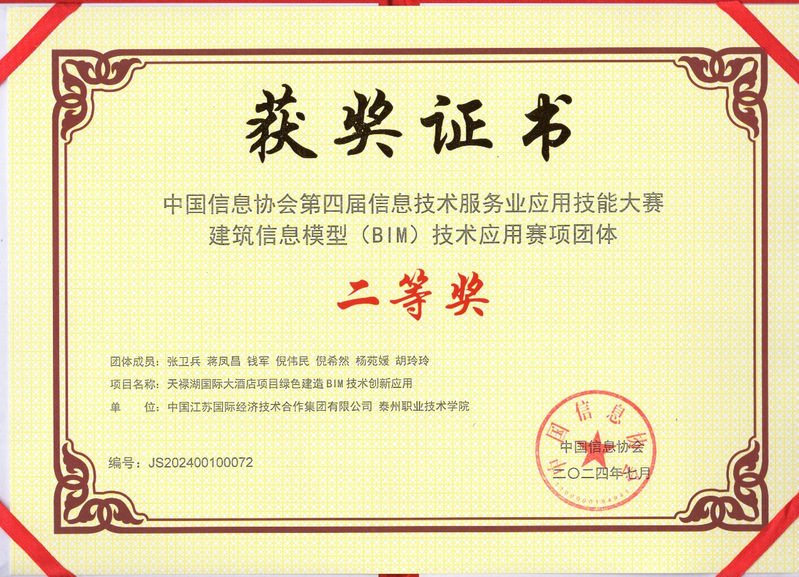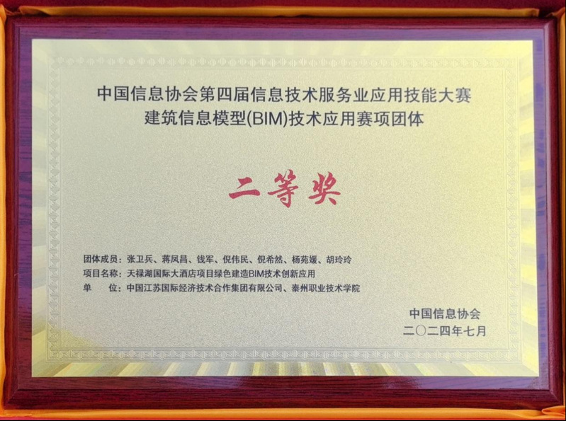近日,我校建筑工程学院和中国江苏国际经济技术合作集团有限公司(特级施工企业)校企合作成果“天禄湖国际大酒店项目绿色建造BIM技术创新应用”荣获中国信息协会BIM大赛二等奖证书和奖牌。我校蒋凤昌、钱军等老师为项目组重要成员。