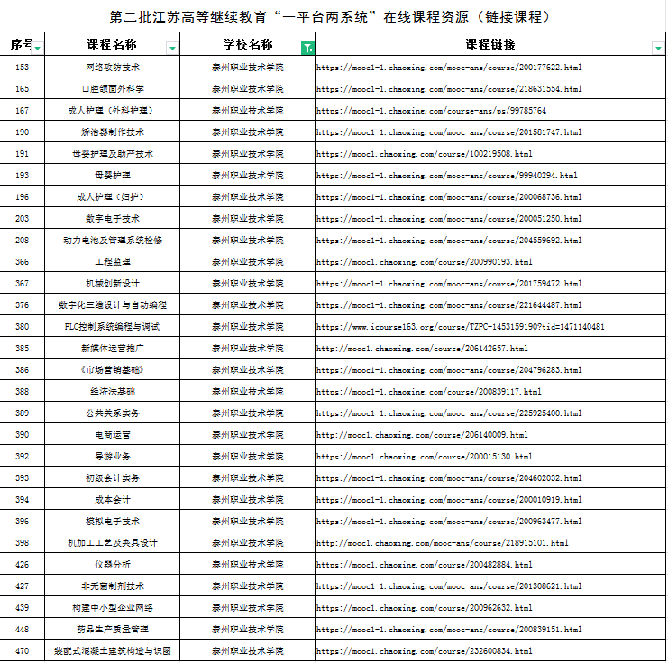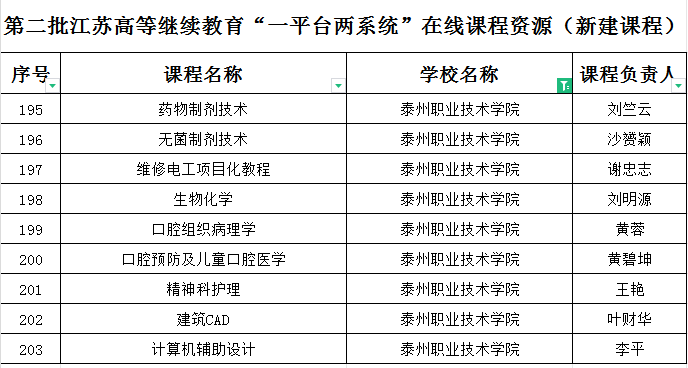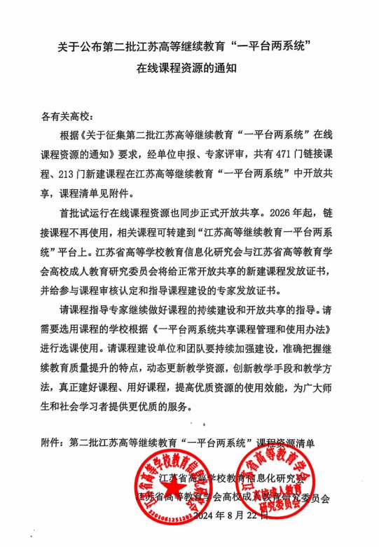 近日,江苏省高等学校教育信息化研究会和江苏省高等教育学会高校成人教育研究委员会发布《关于公布第二批江苏高等继续教育“一平台两系统”在线课程资源的通知》,我校37门课程成功入选江苏高等继续教育“—平台两系统”在线课程资源。