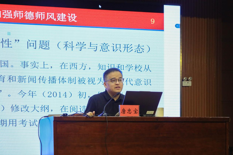 会后,学校邀请了央视《百家讲坛》主讲嘉宾、教育部首批思政工作精品项目“宝哥说”主讲人、江南大学马克思主义学院教授唐忠宝做了专题讲座。讲座主题为《践行教育家精神、加强师德师风建设建设》,围绕提升意识心态、加强师德师风建设,站稳人民立场、警惕错误社会思潮,践行教育家精神、坚定马克思主义信仰三个方面,从“心有大我、言为士责”等六个维度诠释了教育家精神,并结合典型案例解读了师德师风建设要求。(拟稿:柳艳,审核:孟祥山,责编:于美华)
